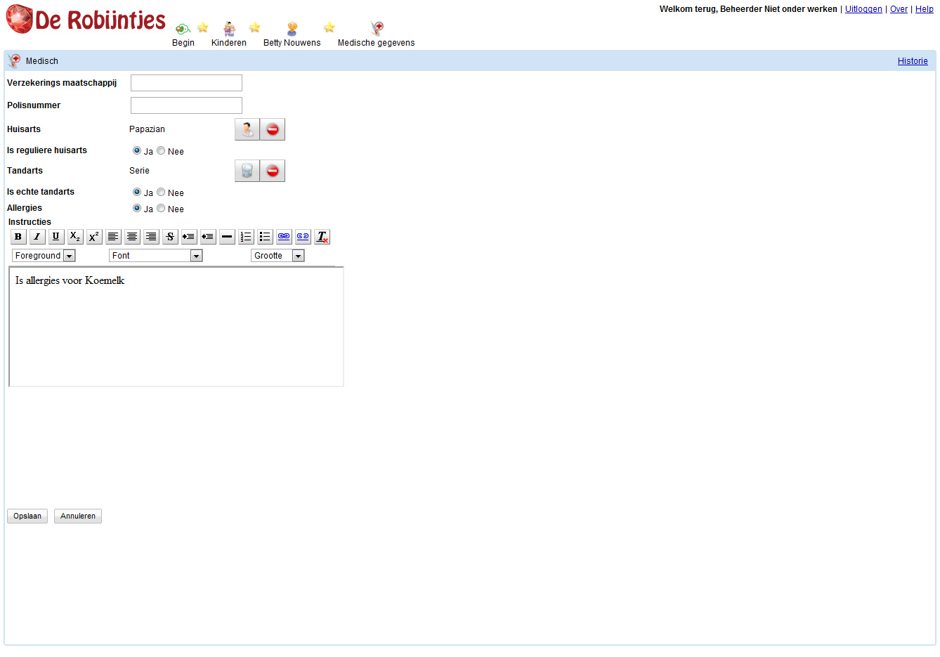Hier kunt u aangeven waarom het icoon medische indicatie verschijnt en andere instructies. U kunt hier ook de huisarts en tandarts gegevens vastleggen. Dit kan handig zijn voor noodgevallen. Deze gegevens worden ook in de groeps module getoond.