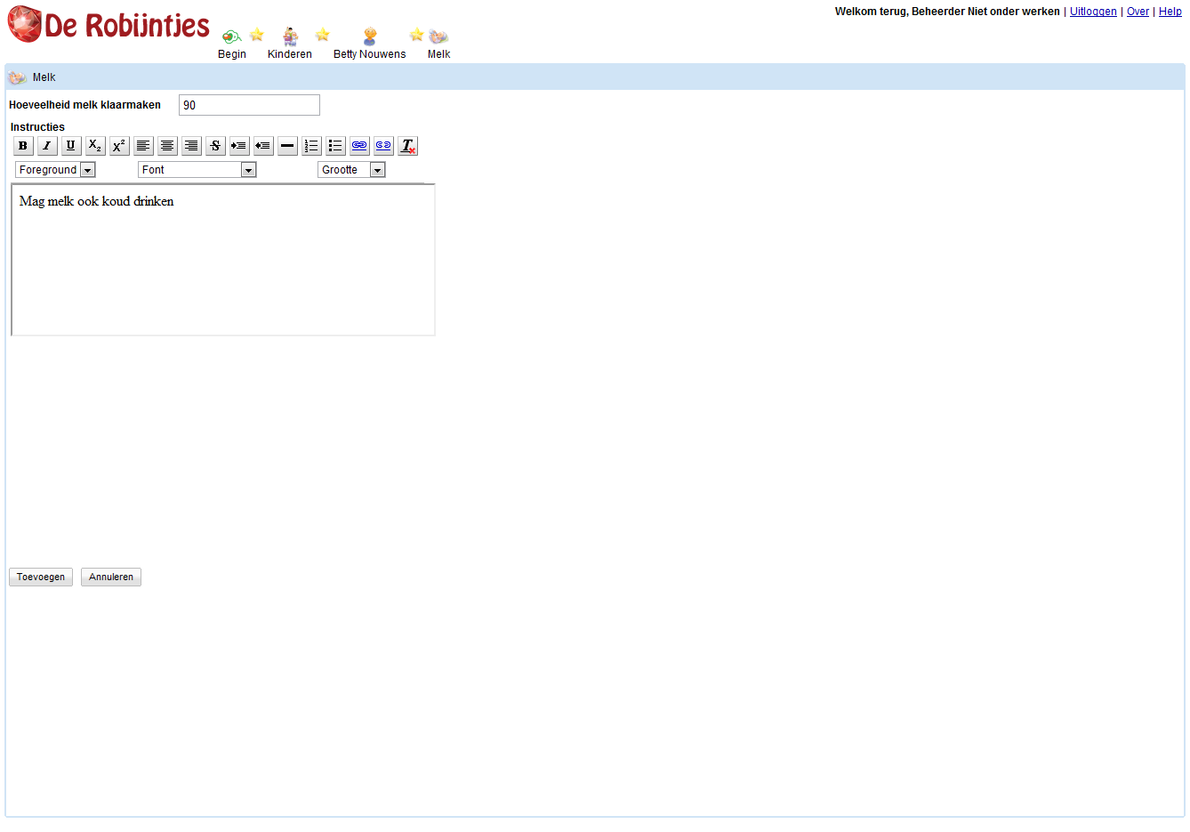 Hier kunt u informatie invoeren over het melk drinken. U kunt hier de hoeveelheid aangeven die aangemaakt moet worden en/of instructies over het drinken of andere gebruiksaanwijzingen.