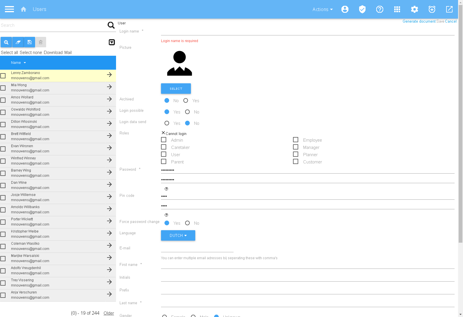 - Nieuwe gebruiker: u kunt nu de gegevens van de nieuwe gebruiker invullen, alle vlakken met een * zijn verplicht om in te vullen. U kunt per gebruiker instellen welke rechten hij/ zij krijgt en eventueel kan er een foto geupload worden. Ook kunt u de logingegevens versturen, zodat de gebruiker voortaan zelf in kan loggen op het systeem. Wilt u dit op een later moment nogmaals doen? Druk dan op “verstuur logingegevens”. Is alles ingevuld? Druk dan op “opslaan””, u ziet nu dat de gebruiker aangemaakt is. Rechts bovenin kunt u nog uit een aantal opties kiezen zoals wijzigen en verwijderen. Ook kunt u de historie (dus wat er met de gebruiker gedaan is in het verleden) weergeven of inloggen als deze gebruiker. Per gebruiker kan er een foto geüpload worden indien gewenst.