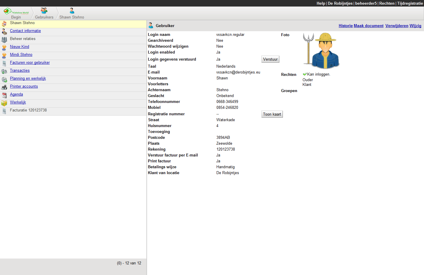 Hier kunt u alle informatie van de gebruiker inzien en beheren. U kunt de contactinformatie inzien, relaties beheren of een agenda inkijken. Ook zijn de kinderen zichtbaar welke gekoppeld zijn aan de gebruiker. Daarnaast kunt u de werkelijke planning bekijken of een factuuroverzicht opvragen.