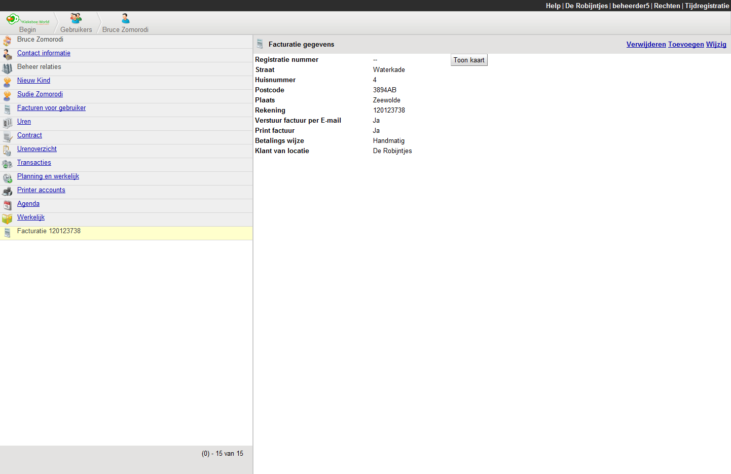 U kunt de factuurgegevens van een gebruiker via Facturatie inkijken. Ook kunt u ze eventueel aanpassen, mocht dat nodig zijn. Voor meer informatie verwijzen wij u graag naar Facturatie . Daar vind u meer informatie over het wijzigen en bekijken van facturen en factuurgegevens.