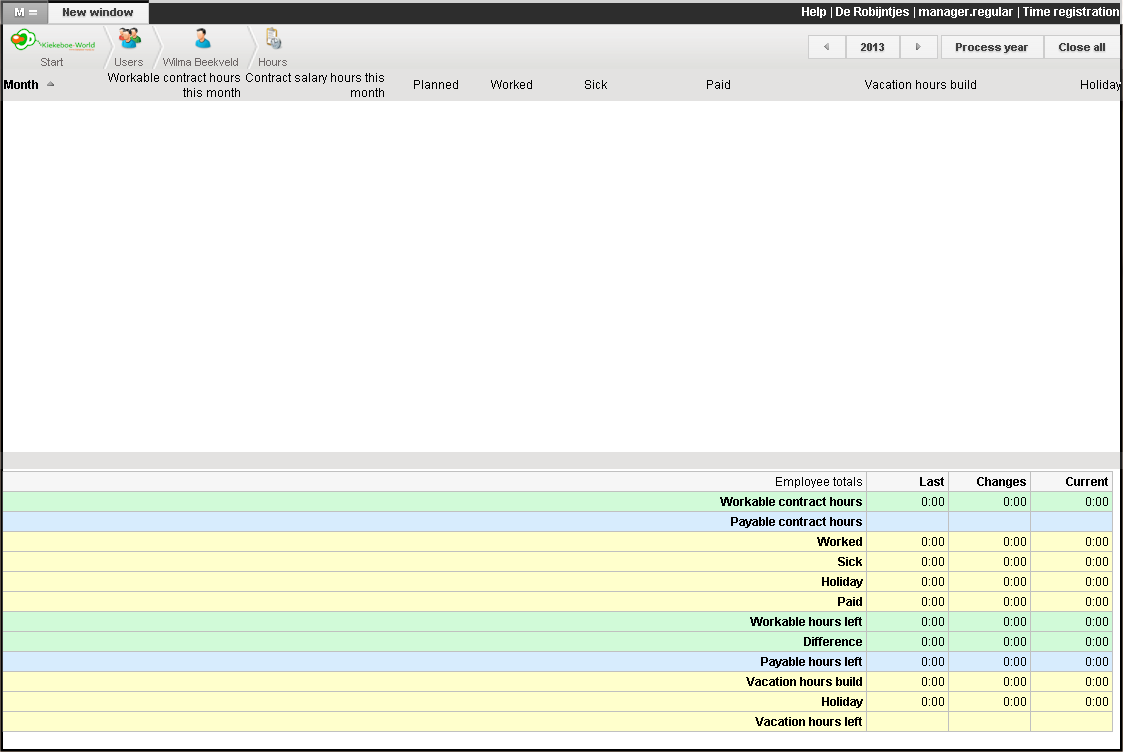 "Uren" geeft een kort en bondig overzicht van de gewerkte uren, contracturen, vakantiedagen en alle andere uren per gebruiker. In het bovenste gedeelte ziet u een overzicht van de contracturen per maand. Bij het selecteren van een contractperiode krijgt u onderin aan de linkerkant een gedetaileerd overzicht te zien, aan de rechterkant ziet u een kort totaaloverzicht van de uren.
