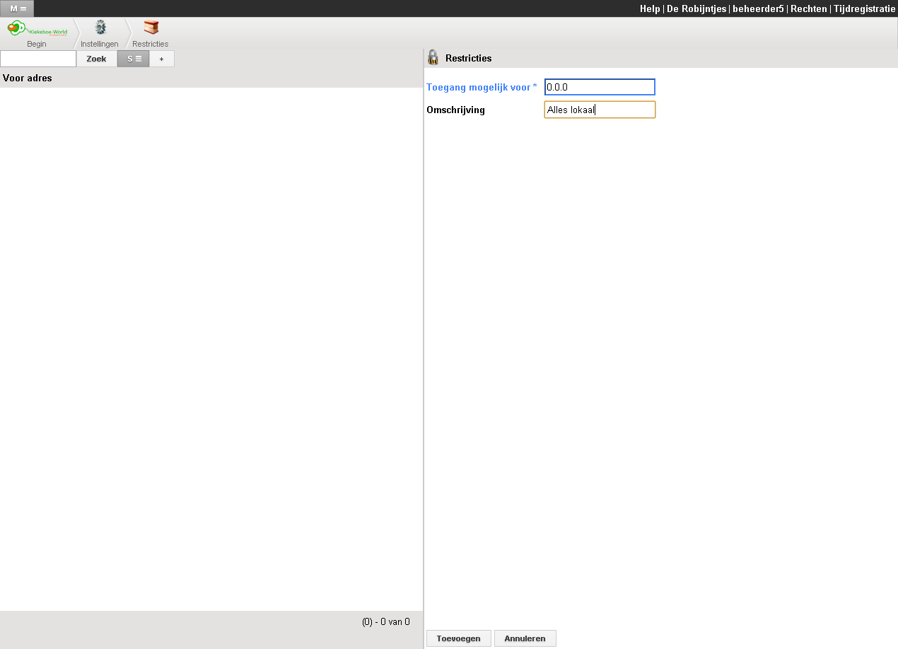 Hier kunt u de toegang regelen tot de groep module en kiosk.Als u een deel van een ip adres invult geeft u alle adressen toegang die dat patroon bevatten. Bijvoorbeeld "129.156.2" geeft toegang voor "129.156.2.23" en "129.156.134" enzovoort.