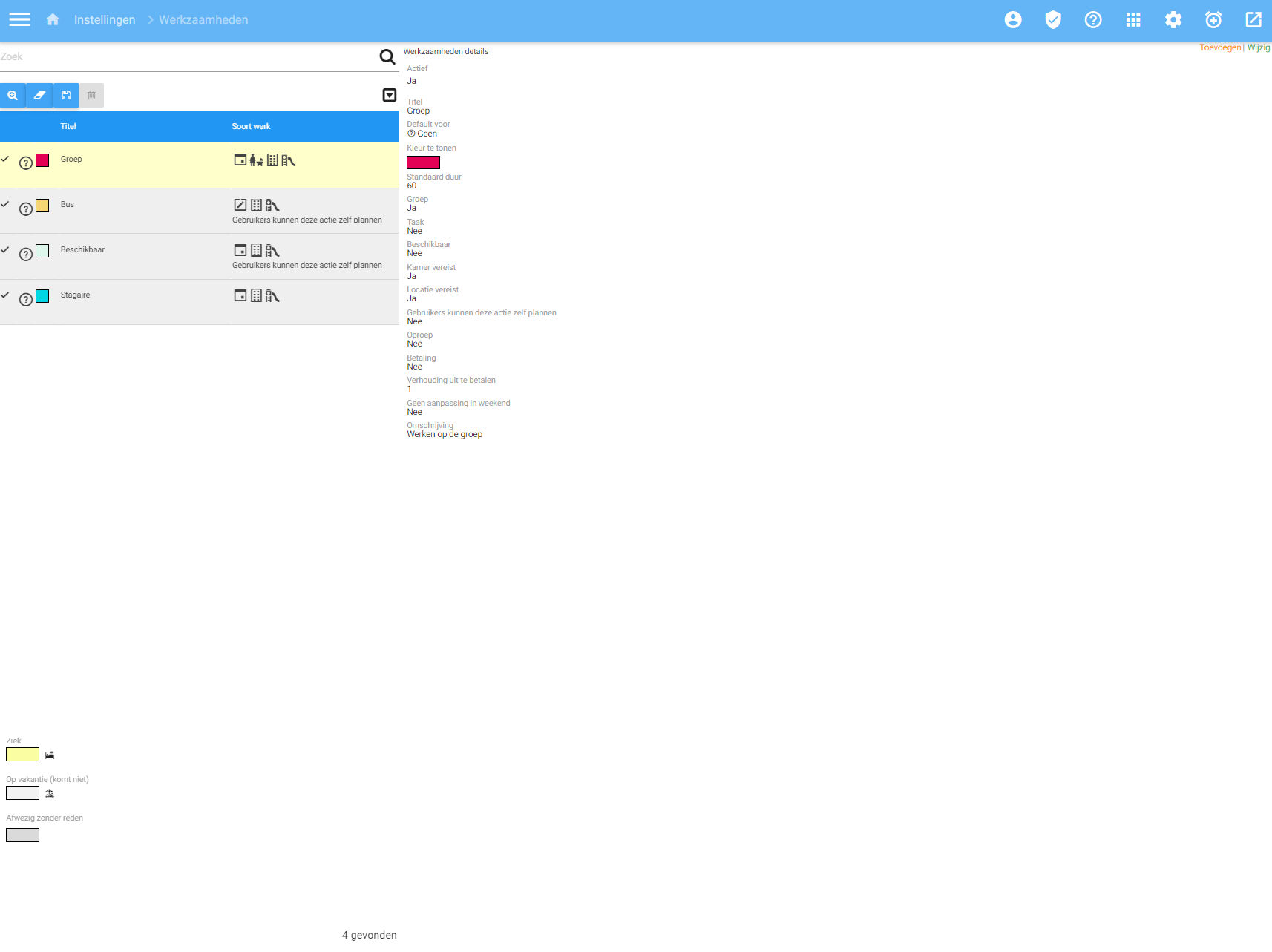 - De kleur te tonen in de agendas. Deze kleuren maken het overzichtelijk, bv voor indirect personeel en leidster per groep een andere kleur. Gebruik hier echter niet 1 van de kleuren gereserveerd voor Ziek, Vakantie of Afwezig.