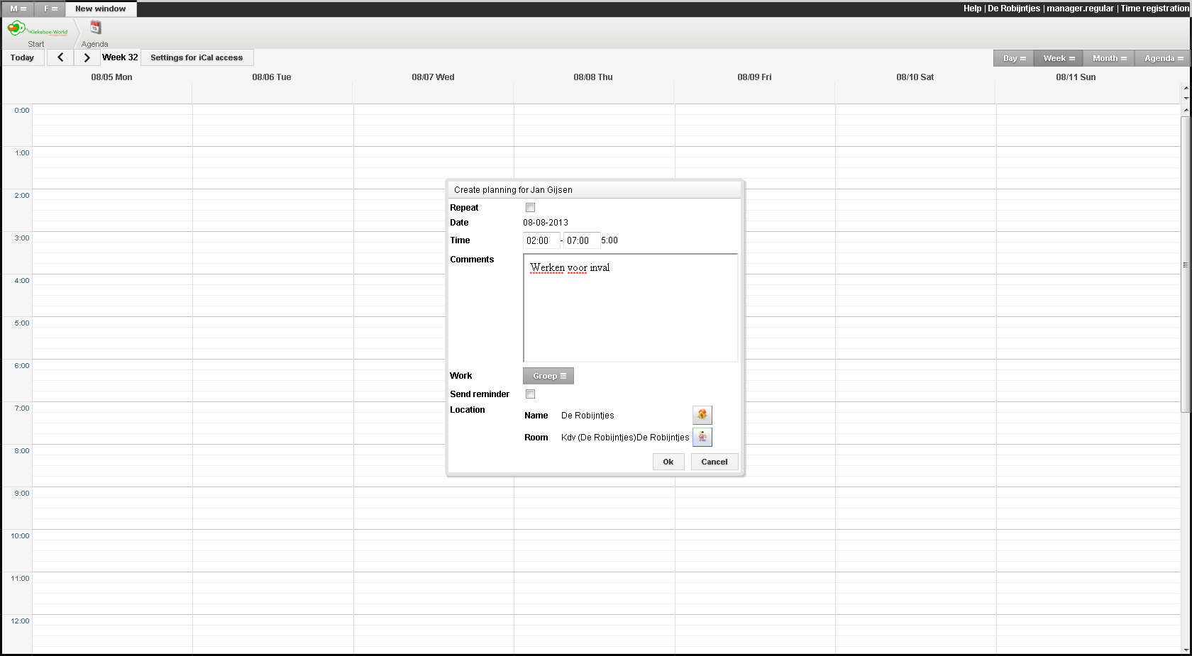 U kunt een agendapunt aanmaken door op de gewenste plek te klikken op de kalender. Daarmee opent u een nieuw scherm waarin u de benodigde gegevens in kunt vullen. Deze gegevens bestaan uit de begin- en eindtijd, of het agendapunt zich moet herhalen (deel uitmaakt van een reeks), onder welke groep het agendapunt valt en de locatie die van toepassing is op het agendapunt. Voor een reeks geldt dat u ook een einddatum dient in te vullen en de interval waarmee het agendapunt dient terug te keren op de kalender. Nadat alle benodigde gegevens ingevuld zijn wordt de knop "Oke" actief en kunt u het agendapunt opslaan.