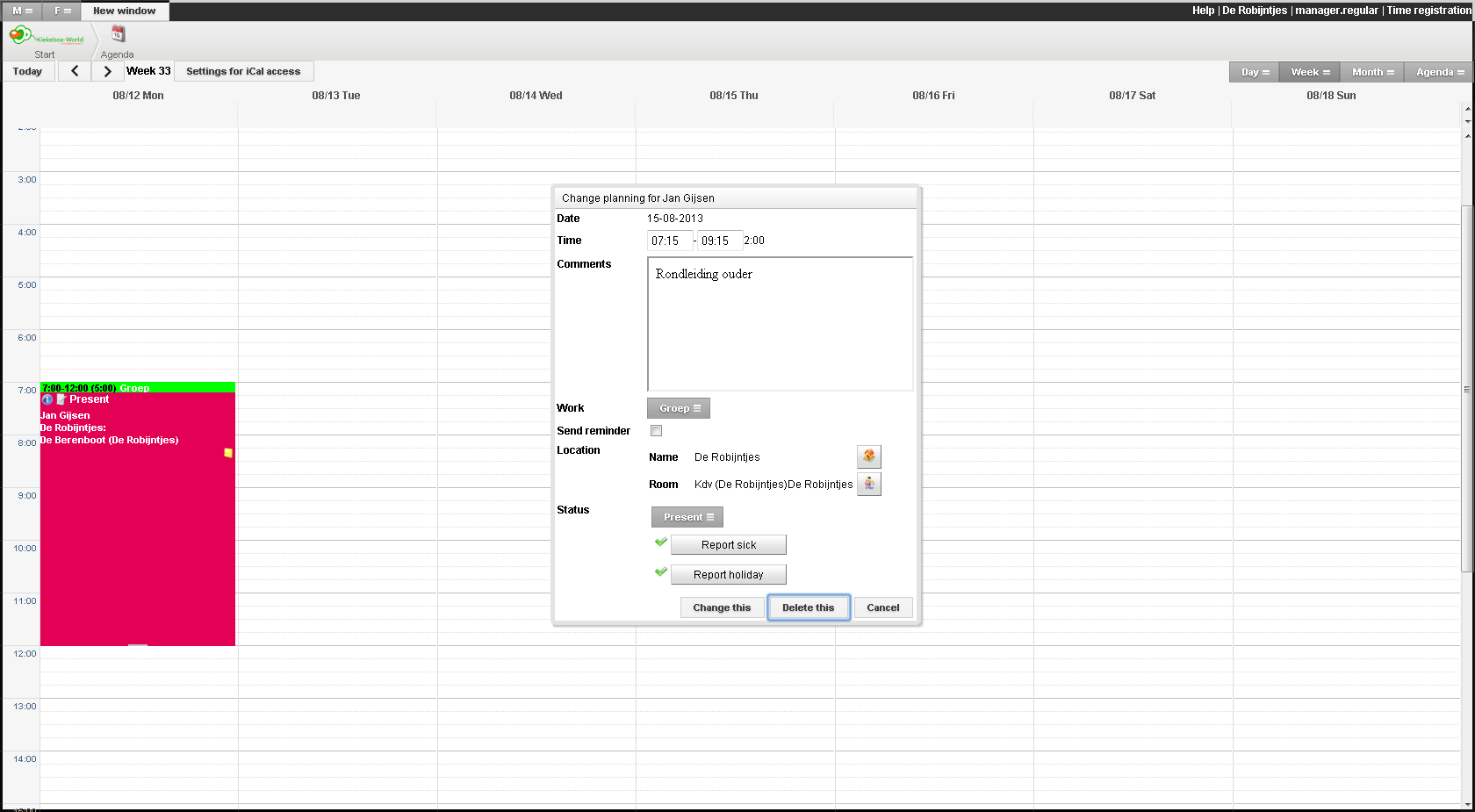 Daarnaast heeft u de keuze om de tijden van een agendapunt te wijzigen middels het verslepen van het agendapunt. Dit kunt u doen door op de balk van het agendapunt te klikken, uw muis vast te houden en weer los te laten op de gewenste tijd. Ook kunt u gemakkelijk de eindtijd van een agendapunt wijzigen door met uw muis op de onderste rand van het agendapunt te gaan staan en deze rand te verslepen naar de gewenste tijd. Deze mogelijkheden hebben echter alleen invloed op de desbetreffende agendapunt, dus niet op de gehele reeks.