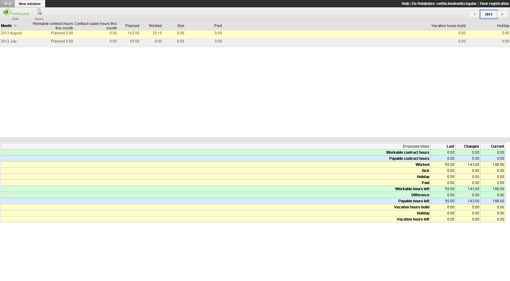 "Uren" geeft een kort en bondig overzicht van de gewerkte uren, contracturen, vakantiedagen en alle andere uren per gebruiker. In het bovenste gedeelte ziet u een overzicht van de contracturen per maand. Bij het selecteren van een contractperiode krijgt u links onderin een gedetailleerd overzicht te zien, aan de rechterkant ziet u een kort totaaloverzicht van alle uren.