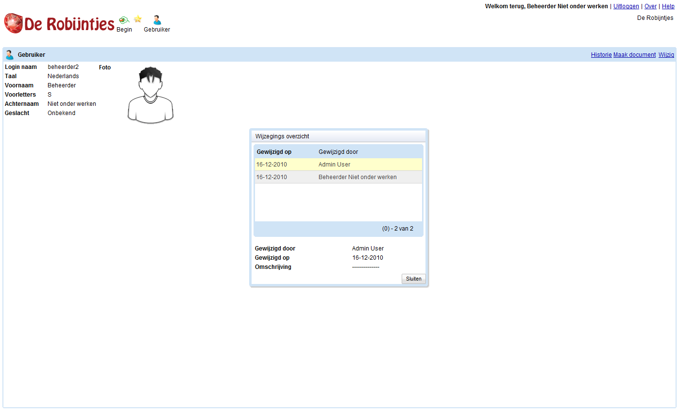 Via de knop "History" kunt u een wijzigingsoverzicht van een gebruiker/ouder bekijken of kind. Zo ziet u in een oogopslag of iemand veranderingen in het systeem heeft aangebracht. Als een ouder in de oudermodule veranderingen aanbrengt in de gegevens van zichzelf of een kind, kunt u dit in het overzicht terugzien.