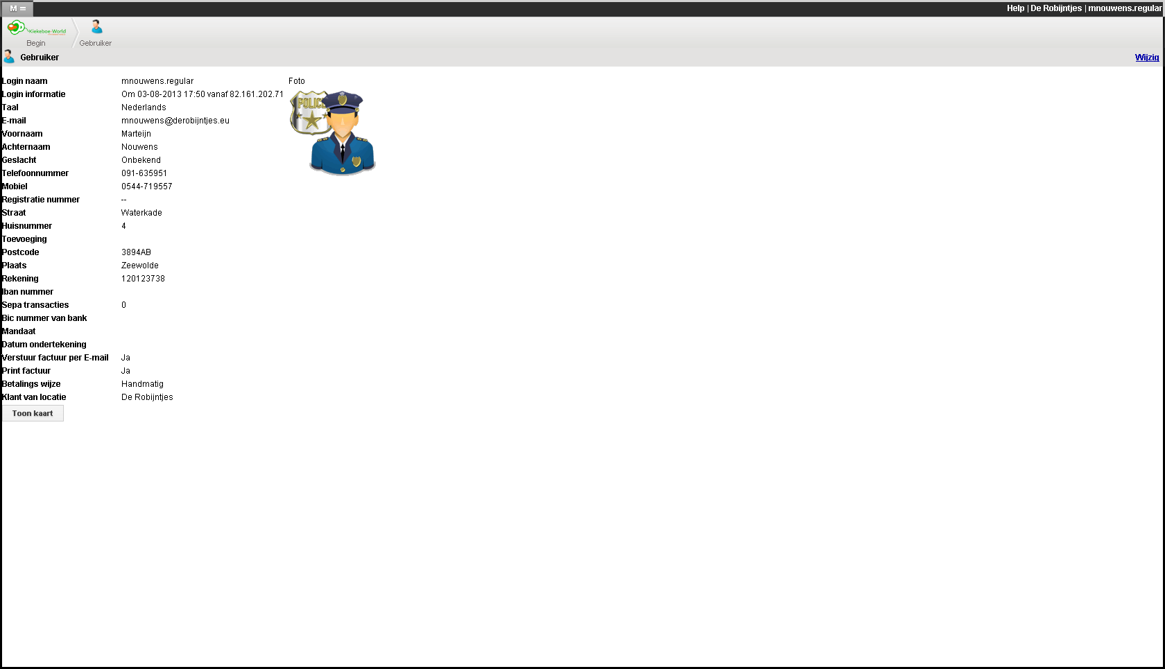 De module "Beheer gebruiker" geeft u de mogelijkheid uw eigen gegevens te bekijken en aan te passen. In het eerste scherm ziet u een overzicht van uw ingevulde gegevens. Ook heeft u de mogelijkheid om de historie van uzelf te bekijken en een document aan te maken.